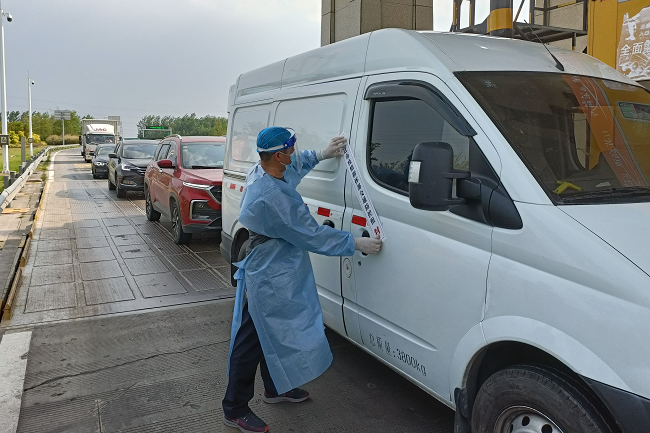 說話間,一輛外地牌照的高風(fēng)險(xiǎn)車輛被執(zhí)勤人員引導(dǎo)至檢查區(qū)域。為有效防范風(fēng)險(xiǎn),陸彬在耐心地向司機(jī)解釋疫情防控政策后,仔細(xì)地在車輛車門處貼上印有“宿遷市疫情指揮部交通防控組封”字樣的封條,并告知司機(jī)不得擅自破壞封條或離開車輛。