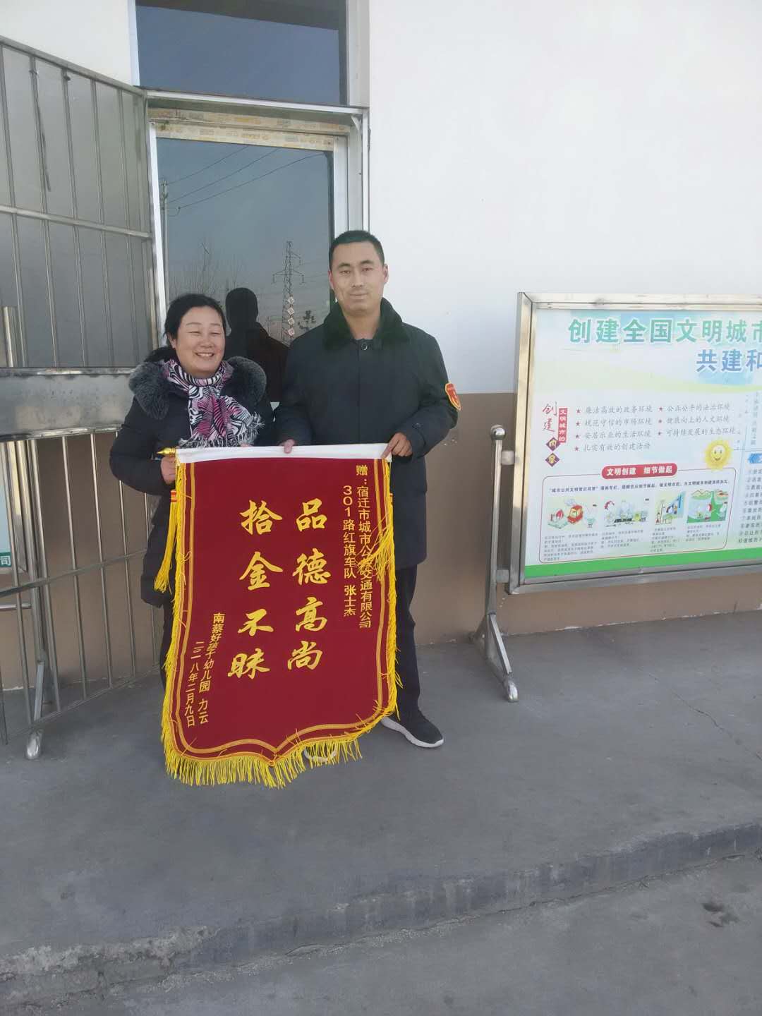 2月12日上午,力云女士來到市交通集團下屬公交公司江蘇財茂城調度站,將一面“拾金不昧,品德高尚”的錦旗送到了301路公交駕駛員張士杰手中。