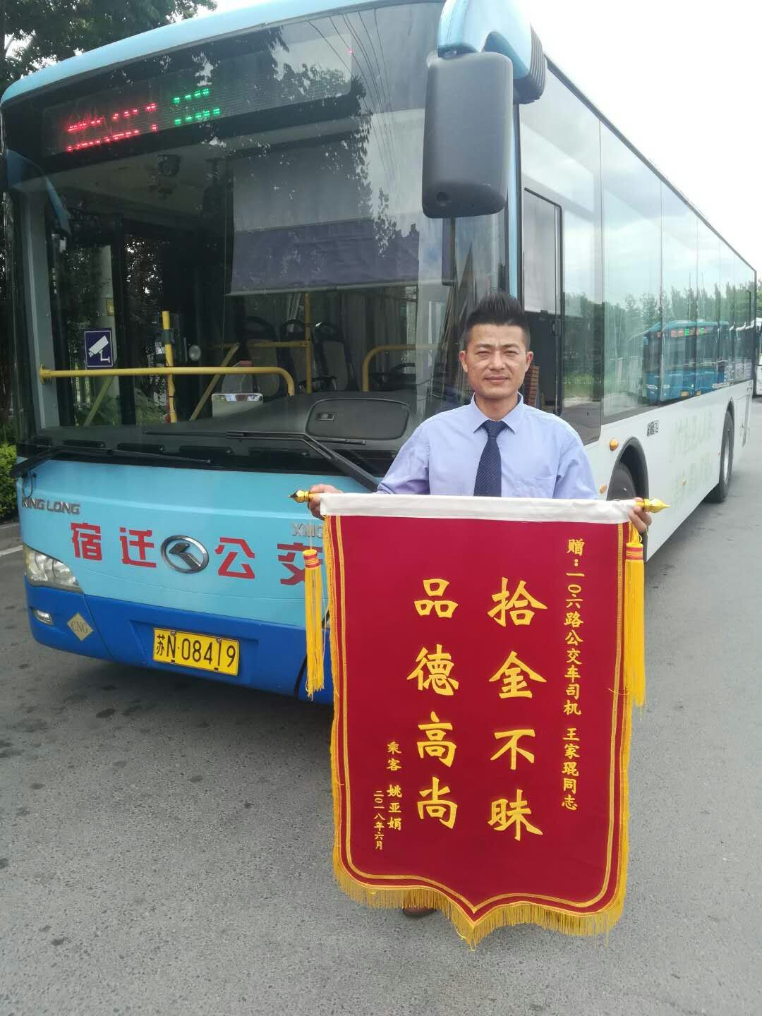6月21日上午10點多,市民姚亞娟女士來到宿遷市交通集團所屬公交公司珠江路公交首末站,將書有“拾金不昧 品德高尚”八個大字的錦旗送到站務室,表達自己對106路司機王家琨的謝意。