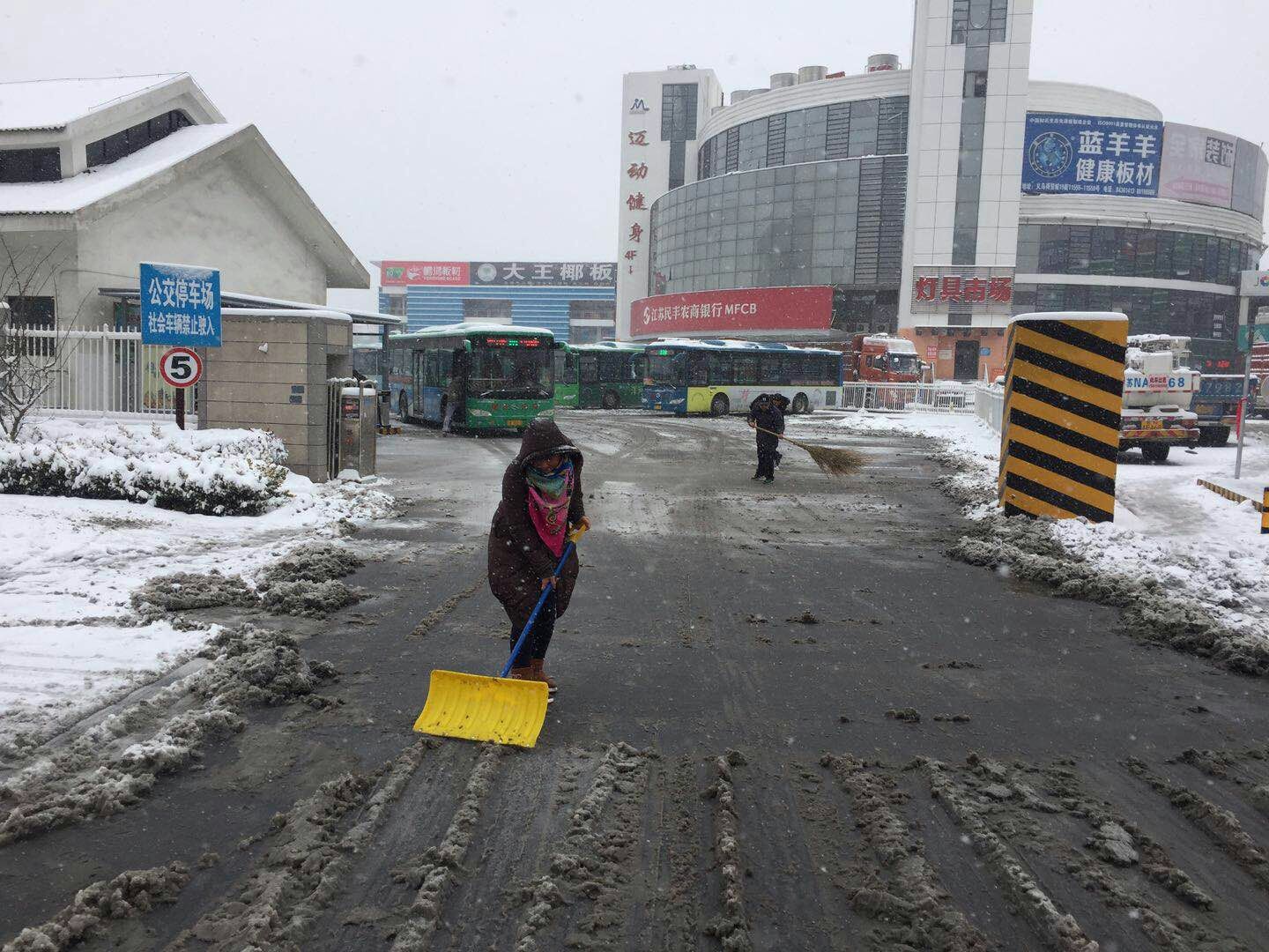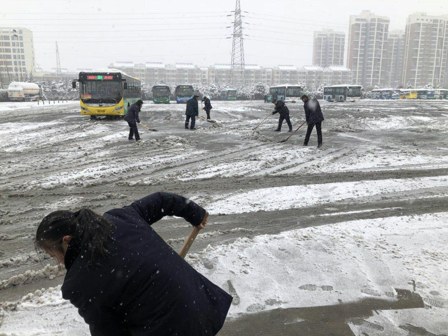 每名員工分工明確,對(duì)場(chǎng)站路面進(jìn)行撒鹽化雪,掃把除雪,鐵鏟除冰,經(jīng)過一小時(shí)的通力奮戰(zhàn),各站場(chǎng)內(nèi)積雪基本清掃干凈,保障了車輛全部上線運(yùn)營(yíng),不耽誤市民出行。