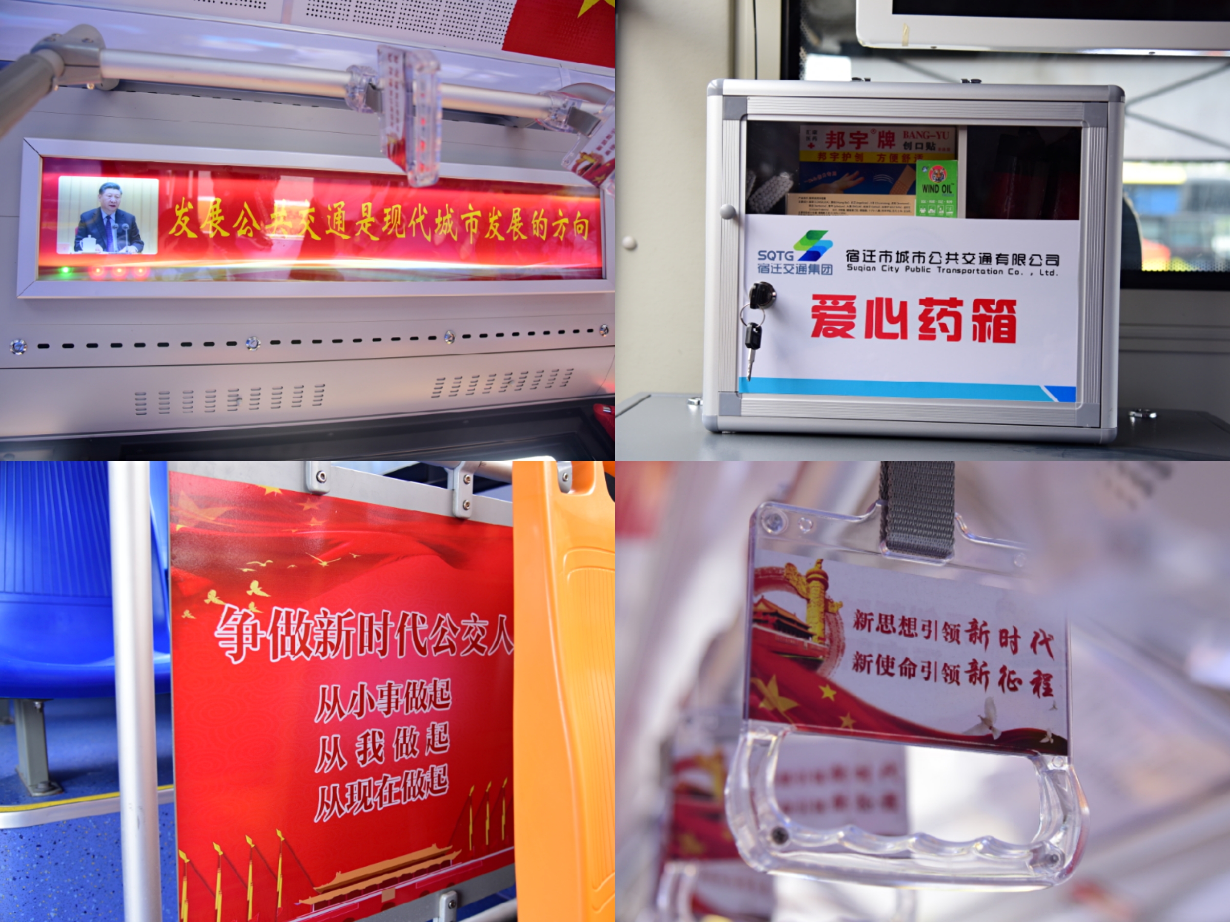 “新時代先鋒號”以車廂為載體傳授學習十九大精神及習近平新時代中國特色社會主義思想的“傳習車廂”。整個車身以紅色基調為主,車身側面以天安門城樓和華表為背景設計并附加車隊 “做時代先鋒,創行業楷模” 口號;車尾部以天安門城樓和高鐵為背景設計宿遷交通人追求 “建設交通強國”的目標;車廂內部燈箱內標語均是采用了十九大相關精神和習總書記部分語錄;車頂覆蓋國旗圖案,即能激發乘客的愛國情懷,也能讓大家提前感受到國慶的喜慶和歡樂。除此以外,該線路所有車輛首次采用中英文雙語報站,為接送南來北往的旅客提供了更加細致的服務,隨車駕駛員均由各線路抽調近年來因好人好事、見義勇為、拾金不昧等事跡被相關媒體報道過的年度先進典型,確保人員隊伍在思想認識、服務水平和業務能力等方面都是優中選優。