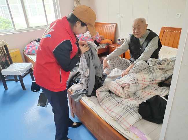 志愿者王琳琳溫柔、耐心地為老人洗頭、洗衣服。嫻熟的動(dòng)作讓老人不禁夸贊:在家里,她肯定也是一個(gè)孝順父母、照顧公婆的的好閨女、孝兒媳。