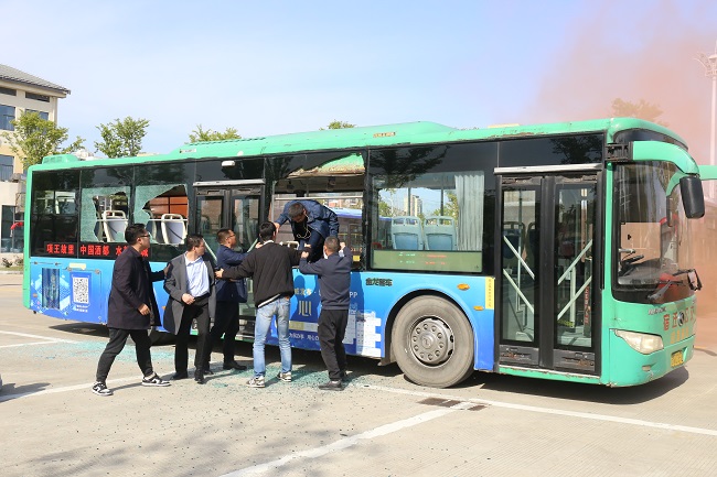 在演練場景二中,公交車運行中突發“火災”,冒出大量濃煙,駕駛員立即靠邊停車,關閉車輛電源,提醒乘客用衣物捂住口鼻防止有毒濃煙侵害,試圖打開前后車門失敗后,引導大家使用安全錘破窗及打開逃生天窗逃生,并使用車載滅火器對起火部位進行滅火處理,防止火勢進一步蔓延,同時求助已安全撤離的乘客立即撥打110、119和120電話,確保將“事故”傷害降至最低。